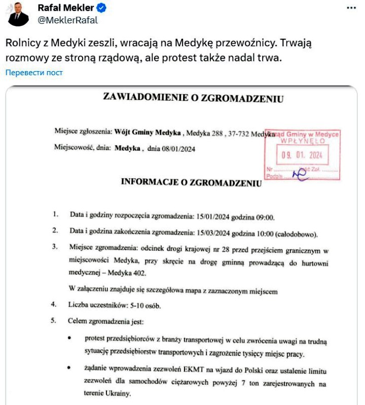 Польские перевозчики грозятся снова заблокировать границу в пункте пропуска «Медика-Шегини» с 15 января до 15 марта. Об этом сообщил организатор блокады Рафал Меклер в соцсети X (ранее Twitter).