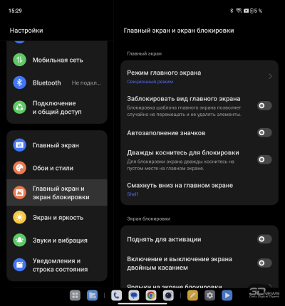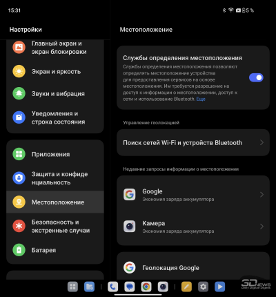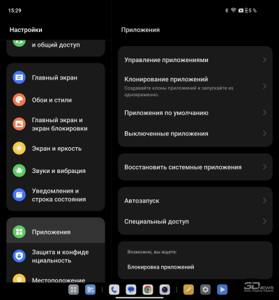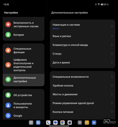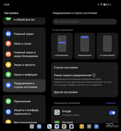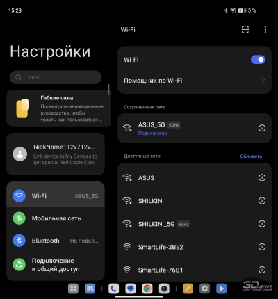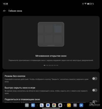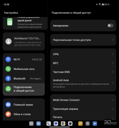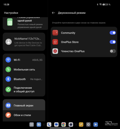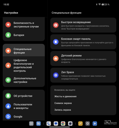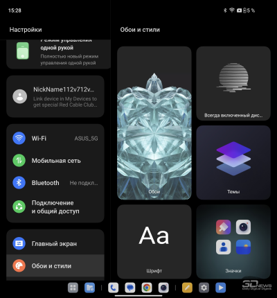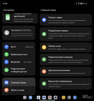 О ColorOS для гибких смартфонов мы уже писали в обзоре OPPO Find N3. Отмечаем хорошую приспособленность программной среды для работы как с узким внешним, так и с широким внутренним экраном: рабочий стол имеет разный вид (стандартный смартфонный – на внешнем, планшетный со всегда доступной панелью быстрого доступа – на внутреннем), панель настроек делится на две части.