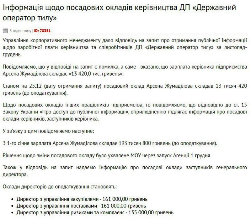 Согласно информации, размещённой на сайте Минобороны Украины, с 1 января оклад главы Государственного оператора тыла Арсена Жумадилова составляет 193 тысяч 800 гривен, директора по управлению закупками — 161 000 гривен, директора по управлению поставками — 161 000 гривен, директора по управлению рисками и комплаенс — 135 000 гривен.