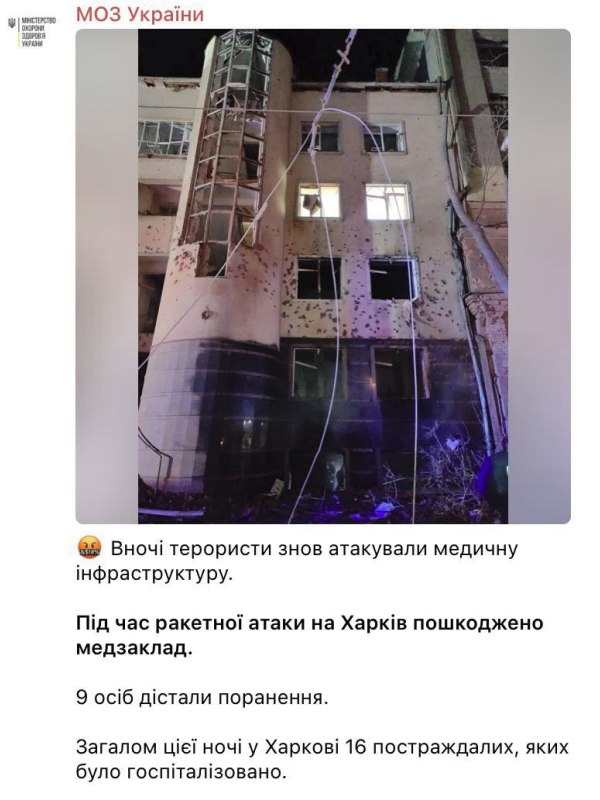 Минздрав Украины также подтверждает, что ночью в Харькове ракетной атакой было повреждено частное медучреждение на улице Благовещенской, и заявило о 9 раненых после прилёта.