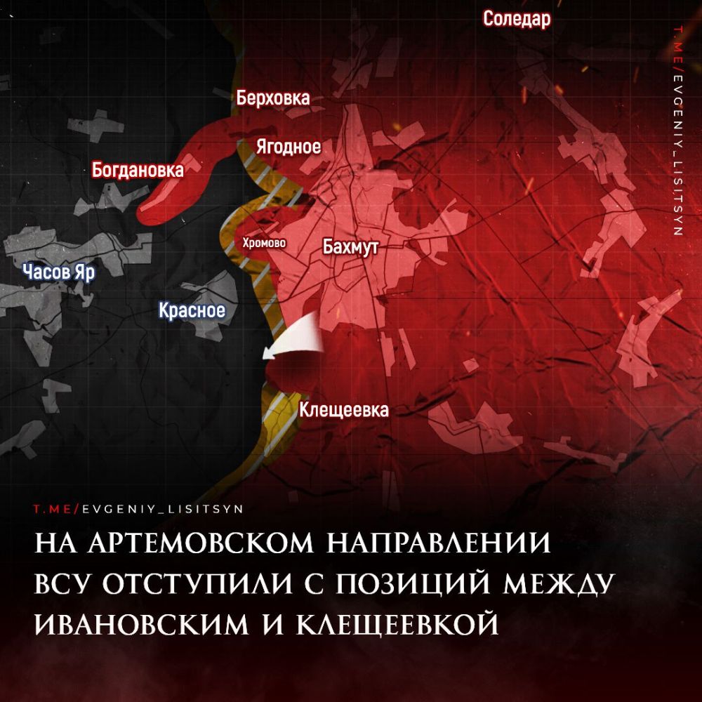 На АРТЁМОВСКОМ НАПРАВЛЕНИИ ВСУ отступили с части позиций между ИВАНОВСКИМ и КЛЕЩЕЕВКОЙ. По данным российской разведки, на рубежах в этом районе противник задерживаться не собирается – считает эти позиции невыгодными для обороны.