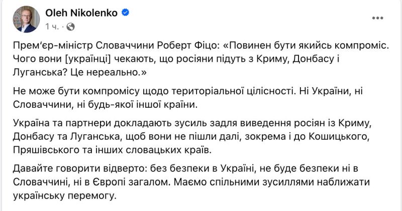 «Должен быть какой-то компромисс. Чего они ждут, что россияне уйдут из Крыма, Донецка и Луганска? Это нереально», — уверен Фицо.