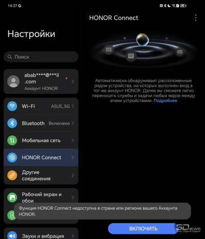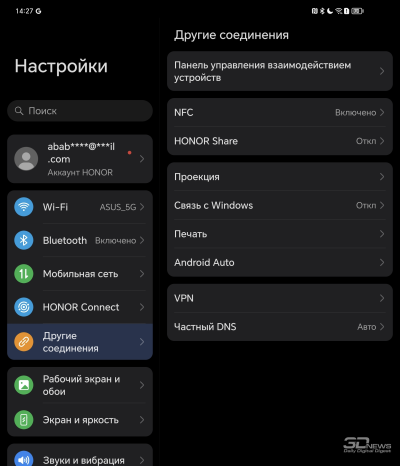 Экран в разложенном состоянии воспринимается очень даже приятно — неизбежная складка-морщина совсем не выражена, разглядеть ее сложно даже при черной заливке экрана, да и в тактильном плане она не мешается. Рамки опять же небольшие, но справа они намного меньше, чем слева, — все-таки идеальной симметрии у инженеров HONOR добиться не получилось.