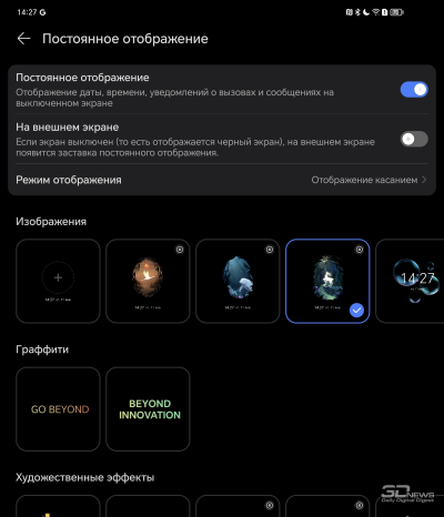 Но есть у HONOR V Purse и индивидуальные особенности, связанные в том числе и с форм-фактором. В сложенном виде на задний экран можно выводить различные изображения. Более того, можно вывести даже какую-нибудь надпись на боковую панель, под которой спрятан шарнир. То есть в теории можно – есть раздел в настройках, где можно выбрать обои и надписи (можно и свою придумать), но на практике там у меня ничего не отображалось. А вот особые динамические обои, изображающие кошелек или сумочку при уровне заряда выше 20%, работали. Это, к слову, очень актуально для смартфона-клатча, ему очень идет.