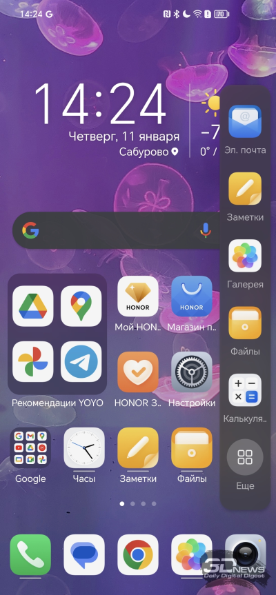 В целом же оболочка типичная для смартфонов HONOR – с акцентом на крупные папки, привычными шрифтами, нормальной навигацией и, главное, стабильно работающая. Отмечу, что, несмотря на китайскую эксклюзивность гаджета, оболочка глобальная, с сервисами Google, без китайских особенностей и уймы китайских предустановленных приложений.