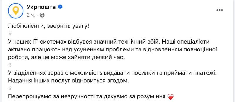Вслед за «Нафтогазом» технический сбой произошел на «Укрпочте», в отделениях могли только выдавать посылки и принимать платежи.
