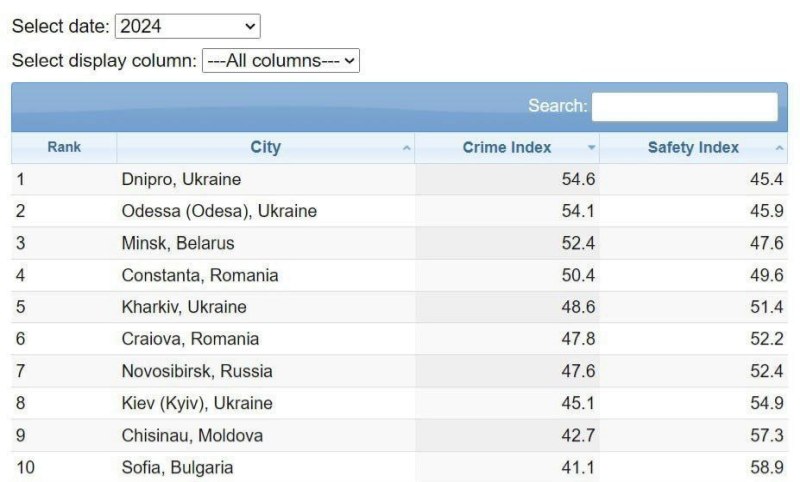 Согласно анализу Numbeo самым опасным городом Европы за последние полгода среди 127 городов Европы назван Днепропетровск. На втором месте в этом рейтинге Одесса. Харьков занял четвертое место, Киев — восьмое.