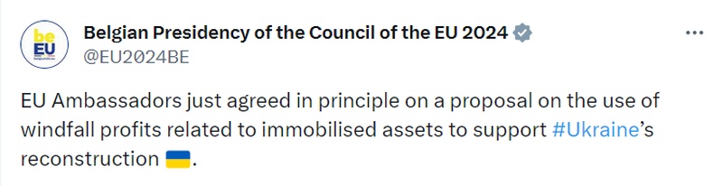 «Послы ЕС достигли принципиального согласия по предложению об использовании сверхприбыли, связанной с замороженными активами, для поддержки восстановления Украины», — говорится в сообщении представительства Бельгии в Совете ЕС в соцсети X.