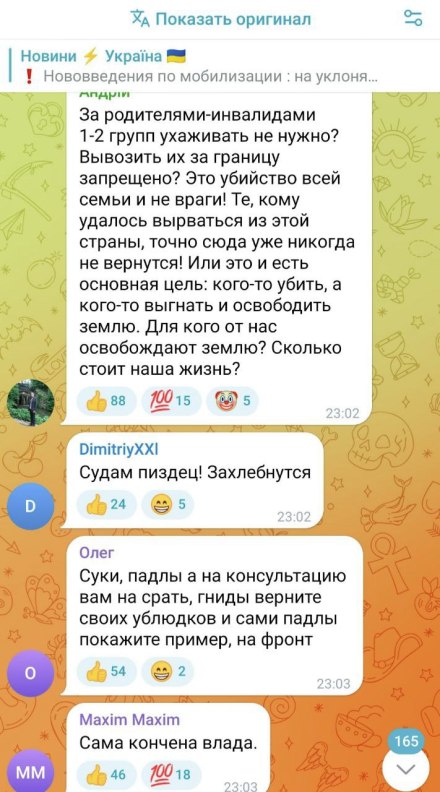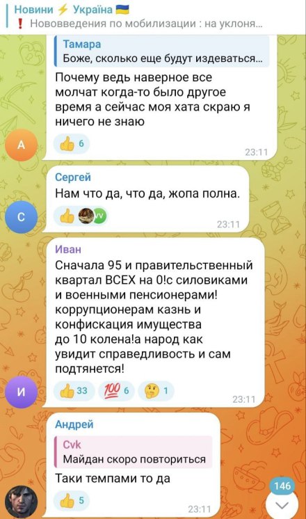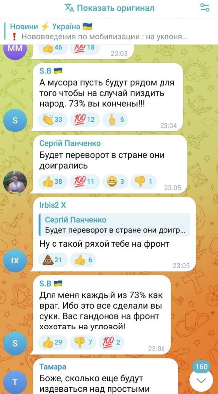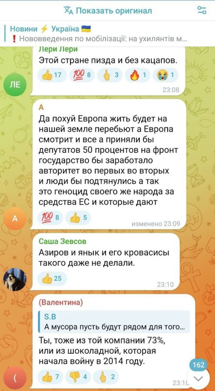 Тем временем, в стране новая волна тотальной мобилизации разворачивается с нотками истерии. Командующий бригады ТРО призывает простреливать колени тем, кто откажется идти на убой, другой нацист обещает натравить на уклонистов «ветеранов».