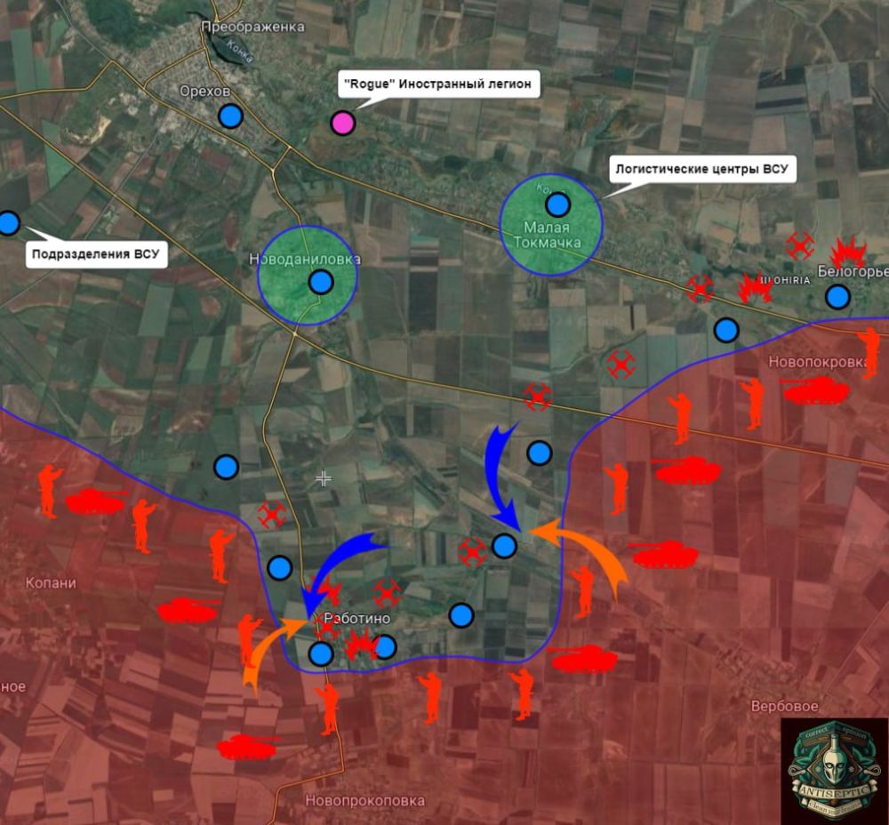 Подразделения ВС РФ атакуют позиции противника в районе РАБОТИНО, западнее ВЕРБОВОГО и севернее НОВОПРОКОПОВКИ. Атаки осуществляются малыми группами, без масштабного наступления, как на ряде других участков. Враг периодически контратакует и сдавать позиции особо не собирается. С политической точки зрения этот участок очень важен для киевского режима, так как ему не хочется терять те территории, которые были захвачены в ходе «контрнаступа» 2023 года.