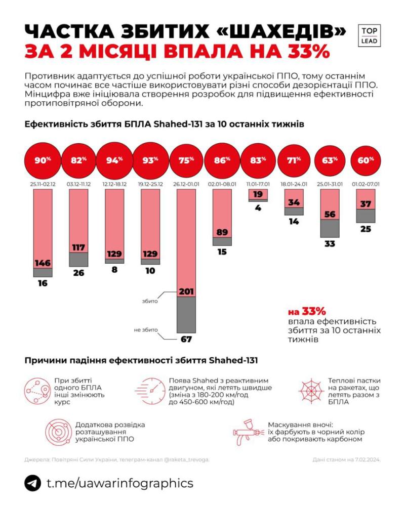 В паблике UA War Infographics отмечается, что за последние два месяца доля уничтоженных БПЛА упала на 33%. Еще в декабре эффективность работы украинских ПВО по беспилотникам составляла около 90% и более. В январе показатели пошли на спад и в первую неделю февраля составили 60%.