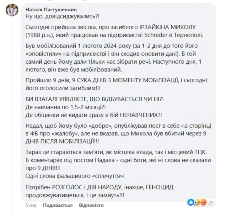 «Умер тернополянин, который мобилизовали 9 дней назад Николай Ирзайкин, работал на предприятии "Шредер". Как случилось так, что 9 дней после мобилизации Николай уже оказался на фронте — вопрос к ТЦК», — говорится в сообщении.
