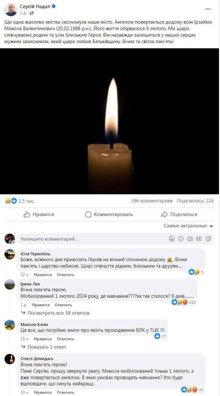 «Солдат Ирзайкин был призван на военную службу по мобилизации 1 февраля 2024 года Тернопольским ТЦК и направлен в учебный центр. 9 февраля на имя начальника Тернопольского ТЦК от командования воинской части поступило сообщение о смерти солдата Николая Ирзайкина в результате острой легочно-сердечной недостаточности, о чем была извещена семья военнослужащего», — утверждают в ТЦК.