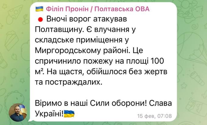 В Полтавской области в Миргородском районе попадание ракеты в складское помещение, скорее всего удар пришелся по складу боеприпасов, в результате которого обрадовался пожар площадью 100 м².