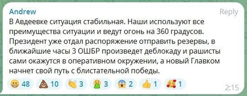 Поэтому Авдеевка у них «держится и перемалывает москалей». А если и не держится, то ничего страшного, ведь этот населённый пункт не обладает тактической, стратегической и экономической ценностью. Кругом пэрэмога, куда ни посмотри.