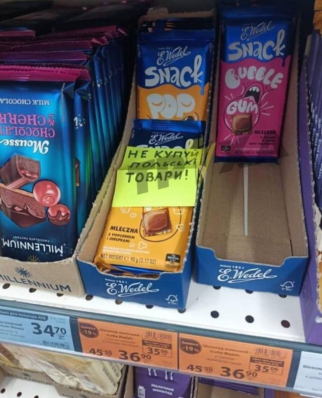 В другом магазине украинские партизаны тайно подложили в коробку с польскими шоколадками записку «Не покупай польские товары!»