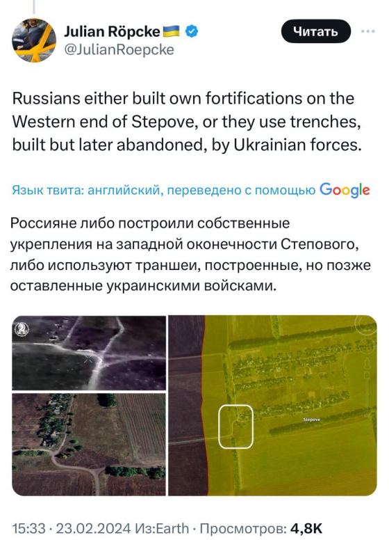 «Украинские ударные рейды, которые ранее доходили до западной части Степового, теперь осуществляются из восточной части Бердычей. Россияне либо построили собственные укрепления на западной оконечности Степового, либо используют траншеи, построенные, но позже оставленные украинскими войсками», — заявляет Репке.