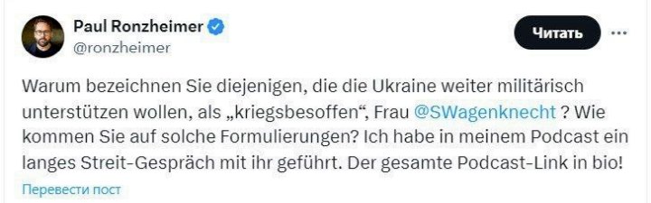 «Вы серьёзно думаете, что, если мы поставим ещё больше оружия, украинцы смогут вытеснить русских из Крыма? Вы считаете, что Россия, ядерная держава, это позволит сделать? <...> Если мы принесём войну немецким оружием в Россию, мы принесём войну в Германию», — приводит её слова немецкий журналист Пауль Ронцхаймер в соцсети X.