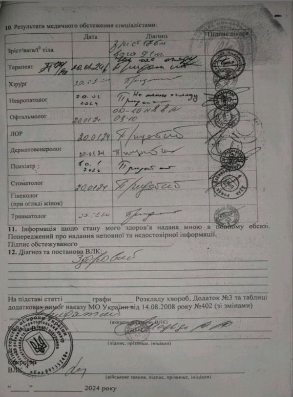 В Хустском военкомате его избили, отобрали документы и мобильный. Затем отвели в подвал, где также издевались, после чего провели на медкомиссию, которая состояла, по его словам, из анализа крови из пальца. Далее был сделан вывод, что Мартыненко годен к службе.