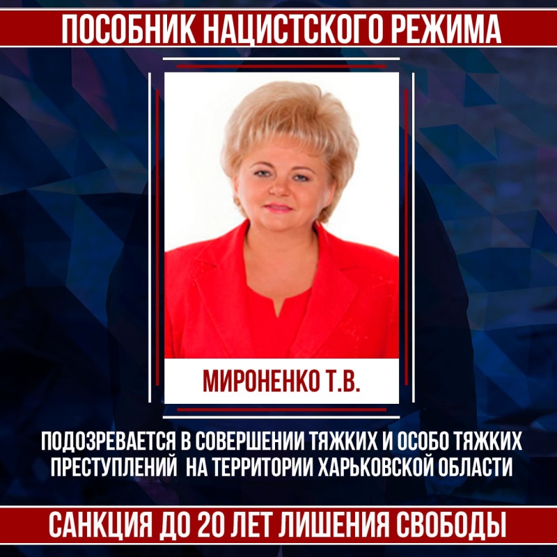 УВД ВГА Харьковской области продолжают объявлять в розыск участников незаконных вооружённых формирований (НВФ) Украины и пособников фашистского режима, совершивших тяжкие и особо тяжкие преступления на территории региона. Не стали исключением и женщины-преступницы, являющиеся депутатами Харьковского городского совета и членами постоянных комиссий от политической партии «Блок Кернеса – Успешный Харьков». Все они разыскиваются в категории «политический деятель, соучастник преступлений киевского режима» по подозрениям в совершении преступлений, предусмотренных ст.210 УК РФ «Организация преступного сообщества (преступной организации) или участие в нем (ней)», ст.276 УК РФ «Шпионаж» и ст.285 УК РФ «Злоупотребление должностными полномочиями». Санкции статей за совершенные ими преступления предусматривают наказание до 20 лет лишения свободы.