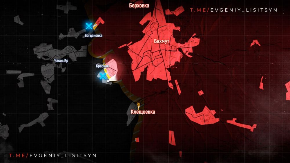 В районе ЧАСОВ ЯРА российская армия вытесняет Вооружённые Силы Украины к юго-западным окраинам ИВАНОВСКОГО (Красного), западнее АРТЁМОВСКА. Также поступают сообщения о столкновениях у БОГДАНОВКИ.