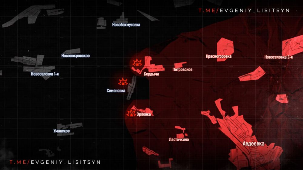 На запад от АВДЕЕВКИ продолжаются боевые действия в районе БЕРДЫЧЕЙ, ОРЛОВКИ и ТОНЕНЬКОГО. Наши силы постепенно наступают, применяя ФАБы для подавления противника. Сообщается о интенсивных боях.