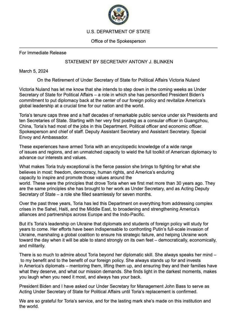 «Виктория Нуланд сообщила мне, что в ближайшие недели намерена покинуть пост заместителя госсекретаря по политическим делам — роль, в которой она олицетворяла стремление президента Байдена вернуть дипломатии центральное положение в нашей внешней политике и возродить глобальное лидерство Америки в критическое время для нашей страны и всего мира», — говорится в письменном заявлении Блинкена.