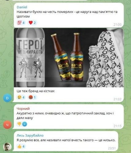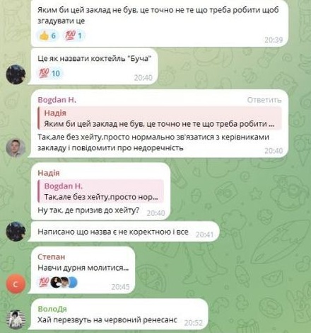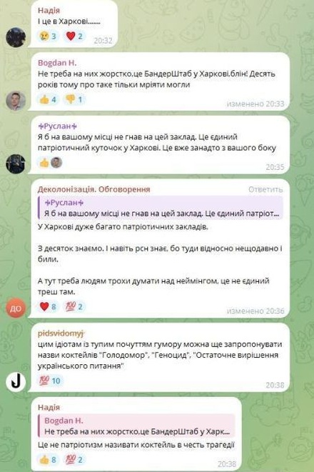Под постом пользователи высказали различные мнения. Одни считают, что это странный юмор, и «это не патриотизм — называть коктейль в честь трагедии». Другие пользователи отметили, что «"Бандерштаб" — патриотическое заведение, и не заслужило слишком жестких высказываний», поскольку десять лет назад о таких заведениях в Харькове «могли только мечтать». А вот здесь они правы. До госпереворота в Киеве в русскоязычном городе Харькове националисты и головы поднять не могли, общались тихонечко на кухне между собой.