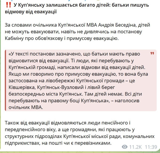 В то же время власти Купянска констатируют, что родители 225 детей написали отказы от принудительной эвакуации из города.