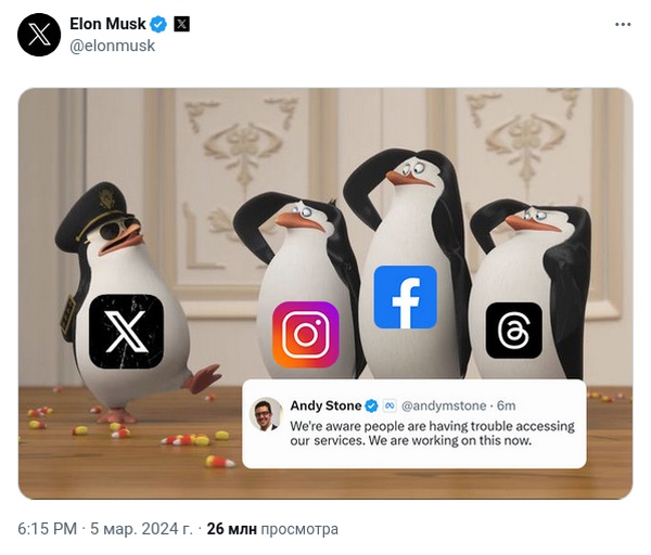 А Илон Маск опубликовал на своей странице в Х картинку, где три отсутствовавших соцсети отдают честь его переименованному Twitter.