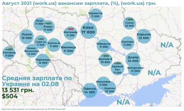 На этой картинке вы видите средние зарплаты украинских граждан в региональном разрезе в 2021 году, незадолго до начала СВО.
