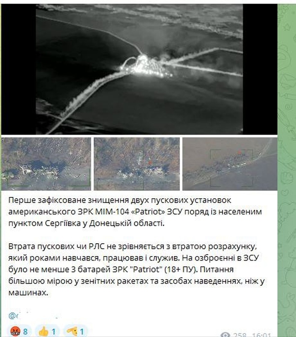 «Сначала баллистическими ракетами был нанесён удар по позиционному району возле с. Сергеевка, в результате которого уничтожено 3 пусковых установки комплекса (судя по детонациям с полным боекомплектом), две машины сопровождения (пикапы), топливозаправщик и, возможно, повреждён радар AN/MPQ-53. После подтверждения поражения комплекса ПВО ещё двумя ракетами нанесён удар по пункту временного размещения (регулярно менял места развёртывания), который противник организовал на территории агрофирмы «Дружба» в с. Удачное, вследствие чего уничтожена машина транспортёр-загрузчик ракет (TLA - Transporter Loader Launcher)», — описал поражение цели американский военный эксперт, бывший американский морпех-разведчик Скотт Риттер в телеграм-канале.