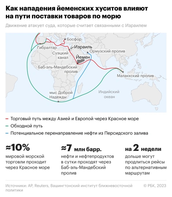 После обострения конфликта в секторе Газа движение «Ансар Аллах» предупредило, что будет наносить удары по территории Израиля и не позволит связанным с ним судам проходить через воды Красного моря и Баб-эль-Мандебского пролива, пока операция в палестинском анклаве не прекратится. С середины ноября прошлого года хуситы атаковали десятки гражданских судов в Красном море и Аденском заливе.