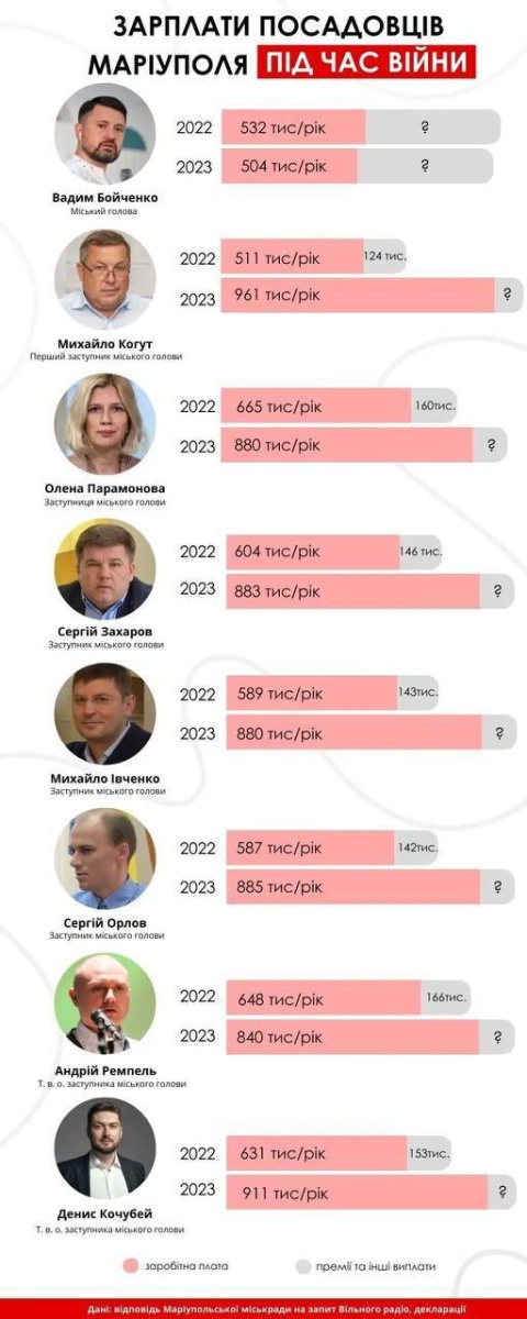 Кроме того, «мэр» и его как бы коллеги продолжают получать зарплату за исполнение своих обязанностей по управлению Мариуполем. И зарплаты эти весьма и весьма серьёзные! Украинские СМИ обнародовали зарплаты мариупольских чиновников – мэра и семи его заместителей. За 2023 год эта орава получила только голых окладов 6 миллионов 744 тысячи гривен (или почти $175 тысяч).