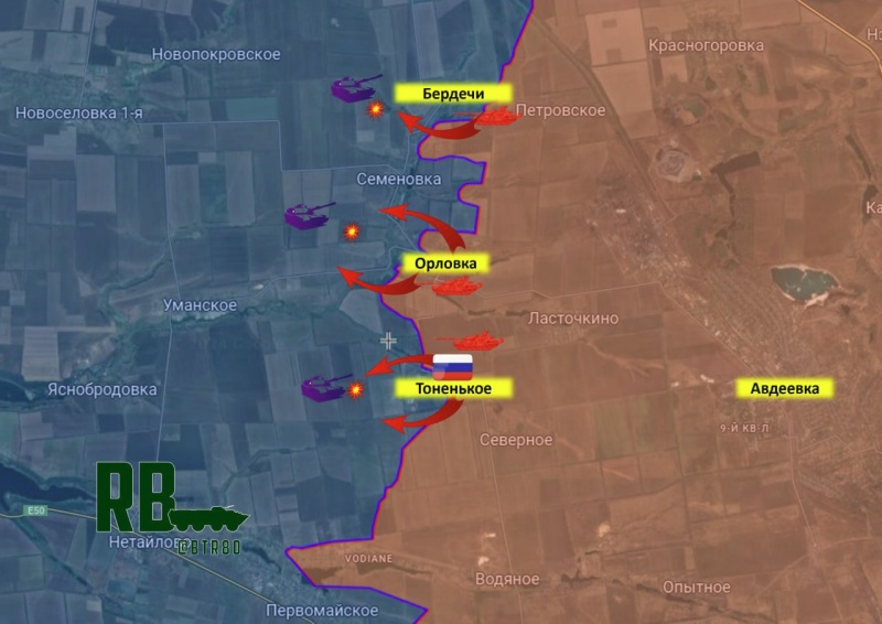 «Теперь необходимо внимательно следить за развитием событий в Семёновке и севернее в районе Бердычей. Из-за потери Тоненького и Орловки эти сёла станут основной точкой приложения усилий украинской армии на авдеевском направлении», — пишет «Военная хроника».