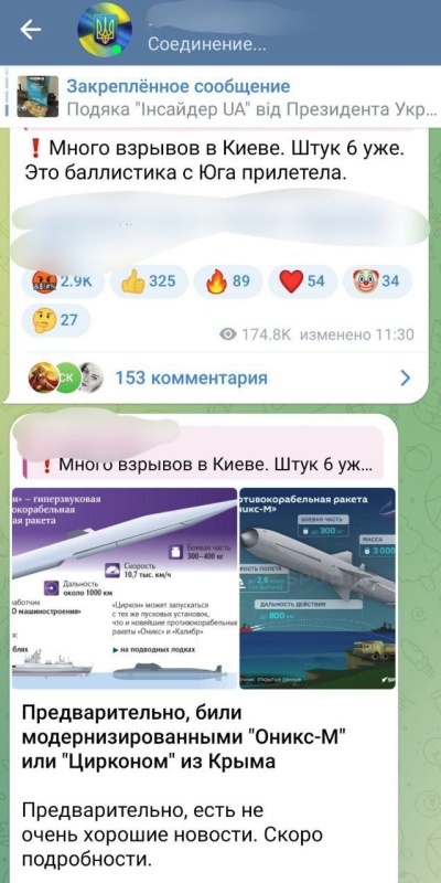 Через 10-20 секунд после включении тревоги в Киеве прогремела серия взрывов. По данным киевских властей, Киев был атакован ракетами «Циркон» с территории Крыма.