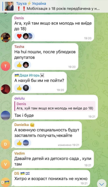 По словам Разумкова, в законопроект заложена «откровенная ложь», которая подрывает доверие к власти. Он добавил, что принятие нормы о мобилизации с 18 лет грозит уничтожением генофонда государства. В связи с этим Разумков хочет услышать позицию Минобороны.
