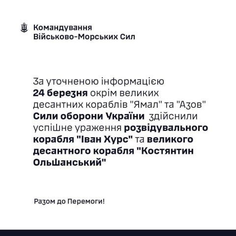 Вооруженные силы Украины во время массированного ракетного удара по Севастополю 23 марта якобы повредили российский военный корабль «Иван Хурс». Также утверждается о нанесении удара по десантному кораблю «Константин Ольшанский», который до 2014 года принадлежал Украине.