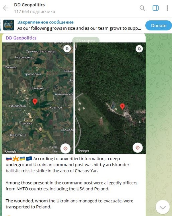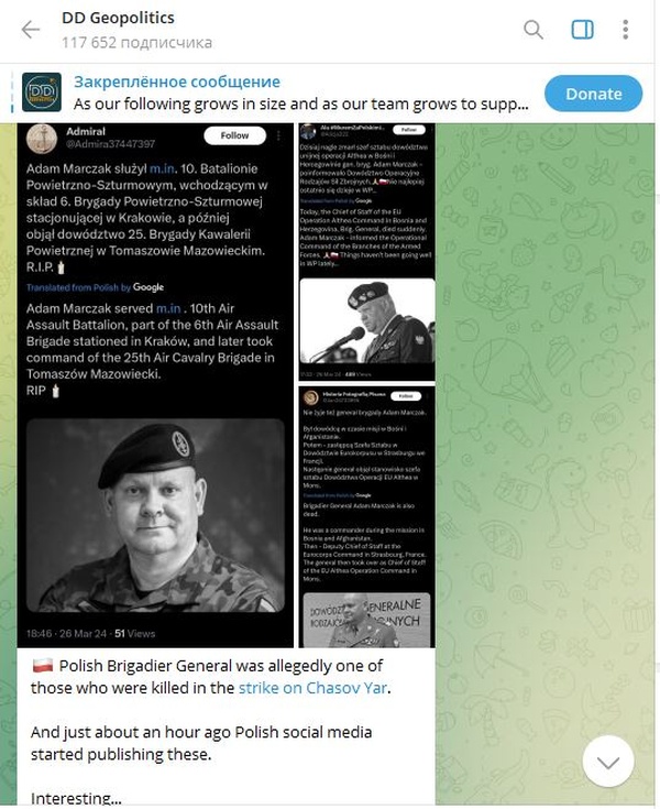 Также военные телеграм-каналы, ссылаясь на источники, сообщают, что в подземном штабе в Часов Яре был ликвидирован не только бригадный генерал Польши Адам Марчак, но ещё несколько высокопоставленных офицеров НАТО.