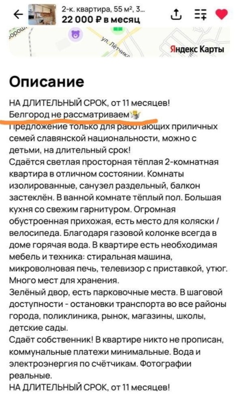 Отказывают в съеме жилья не только в других регионах, но и в наиболее спокойных районах Белгородчины – в Старом Осколе, Губкине. «Нет, нет, белгородцам не сдаем. Вас потом еще не выселишь», - заявил один владелец жилья.
