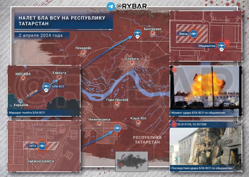 По данным «Rybar», беспилотные летательные аппараты были запущены с приграничных районов Харьковской и Сумской областей, и они преодолели расстояние свыше 1200 км на низкой высоте над западной частью России. Это первая атака беспилотников ВСУ по Татарстану.