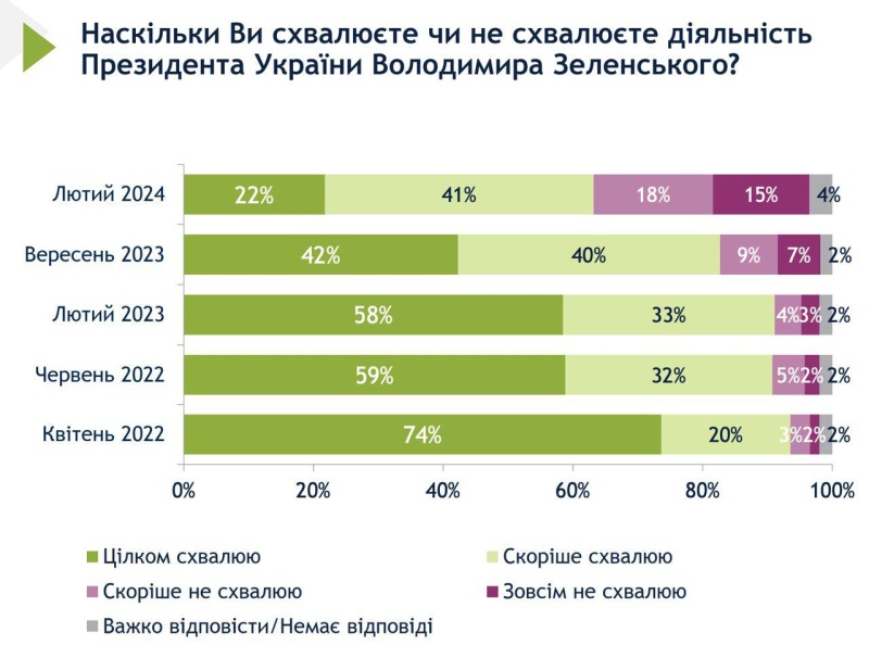 То есть президента все еще поддерживает большинство, но за 2 года конфликта идет стабильная тенденция на снижения рейтинга. 2 года назад, в апреле 2022 года, Зеленского полностью поддерживали 74%. Чуть менее чем через год, в феврале 2023 — уже 58%. Еще через год — уже 22%.