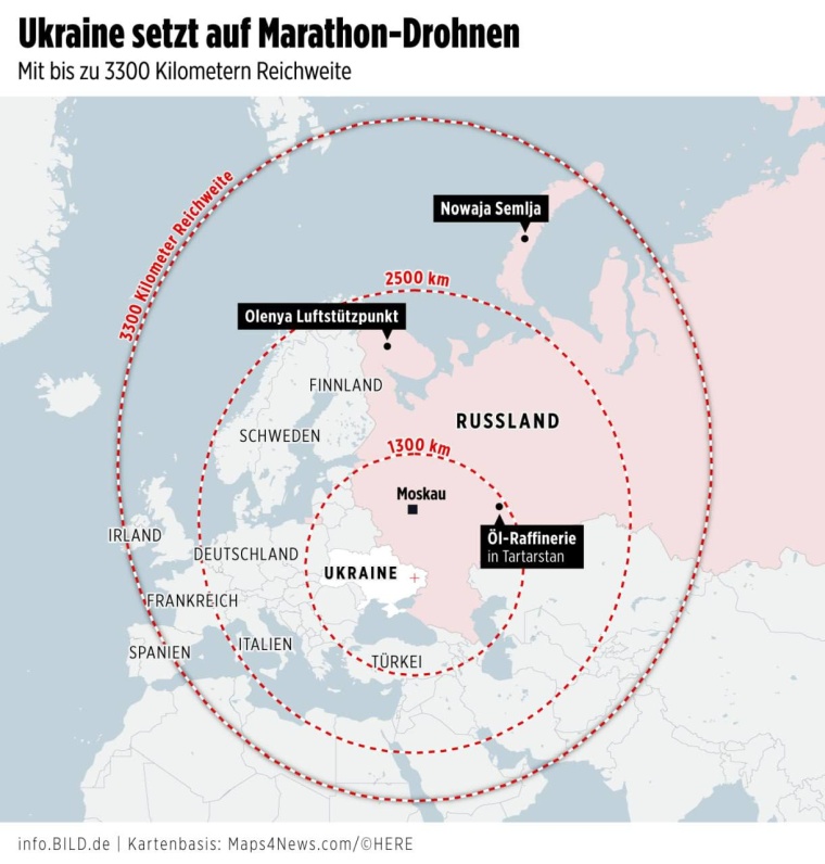 По расчётам Bild, новое украинское оружие сможет атаковать цели, например, в Мурманской области. Там расположены около 80 военных баз. В их числе аэродром Оленья, где базируются стратегические бомбардировщики. ВПК США стоят за разработками дронов. Без спутниковой навигации дроны летят вслепую. Нужен и спутниковый интернет, что уже обеспечивает система Skylink.
