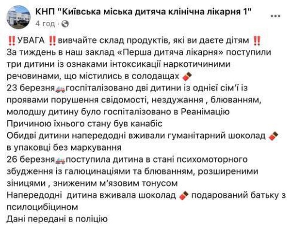 «Причиной их состояния был каннабис. Оба ребенка накануне употребляли гуманитарный шоколад в упаковке без маркировки», – говорится в сообщении.