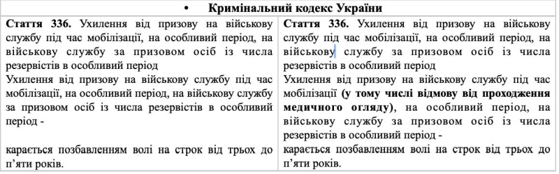 В поданной правительством редакции законопроекта указано, что «уклонение от призыва на военную службу по мобилизации (в том числе отказ от прохождения медицинского осмотра) наказывается лишением свободы на срок от трех до пяти лет».