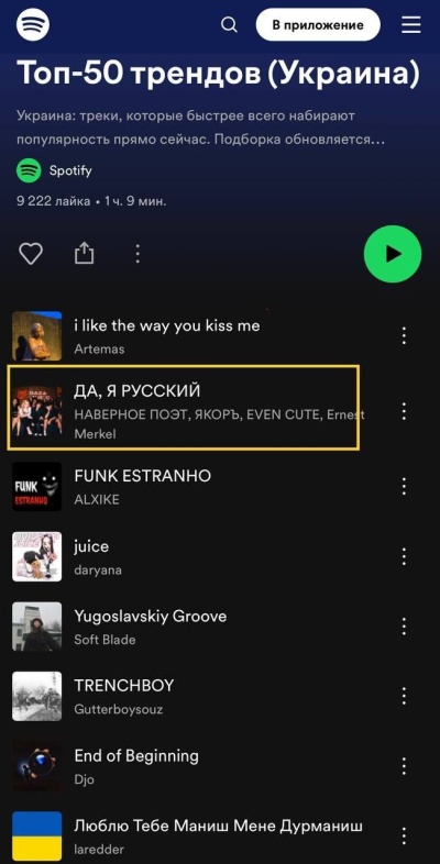 Музыкальный приговор песне «Батько наш Бандера, Украина – мать» вынесен украинской музплощадкой Spotify на третьем году войны. Популярный цифровой сервис Spotify опубликовал рейтинг песен, которые в текущем месяце пользуются наибольшей популярностью среди слушателей из Украины. Второе место в этом рейтинге занял трек с красноречивым названием «Да, я русский».