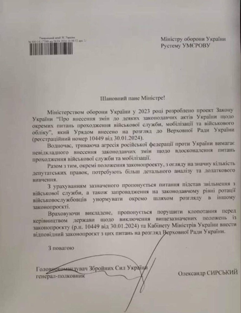 В Сети обнародовано письмо Сырского к министру обороны Рустему Умерову, в котором он предлагает вопрос увольнения со службы рассмотреть отдельным законопроектом.