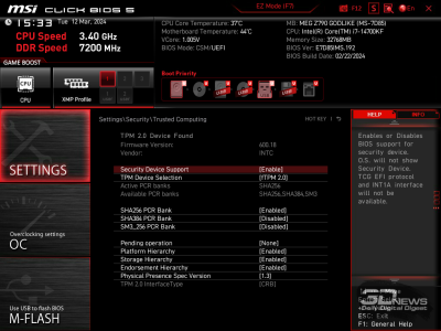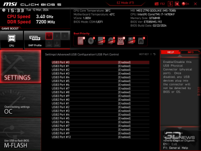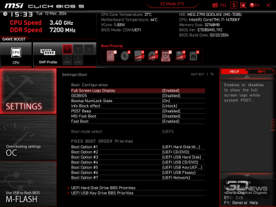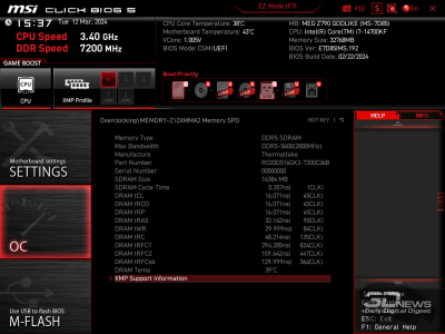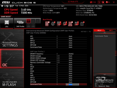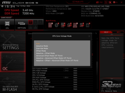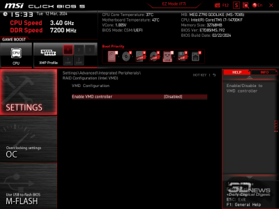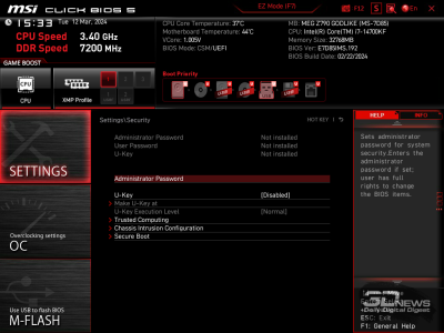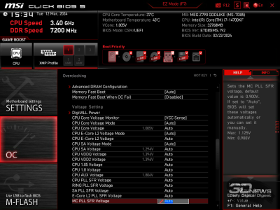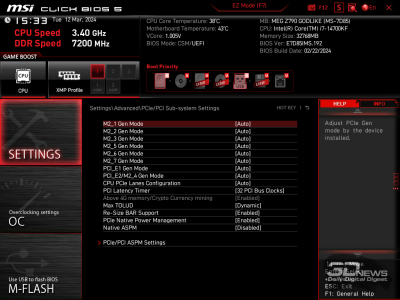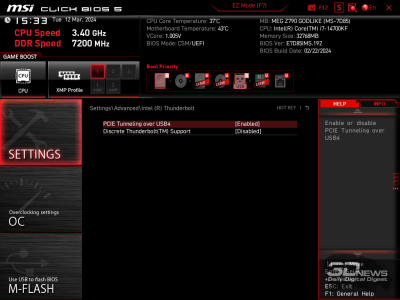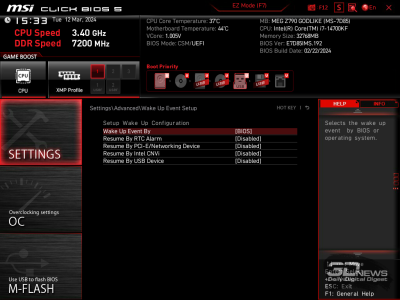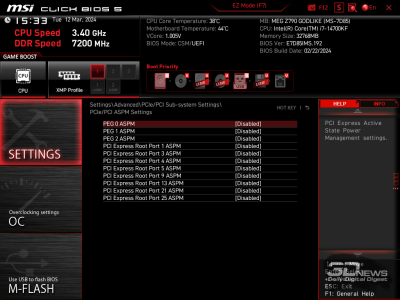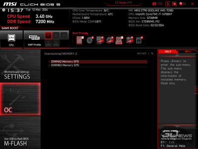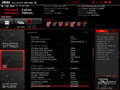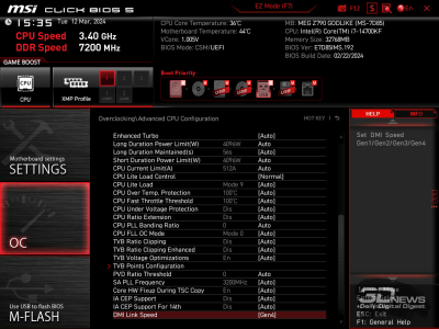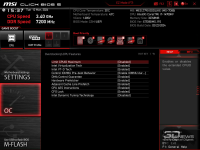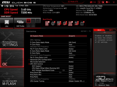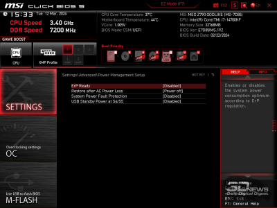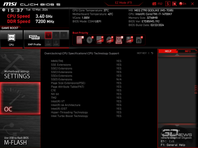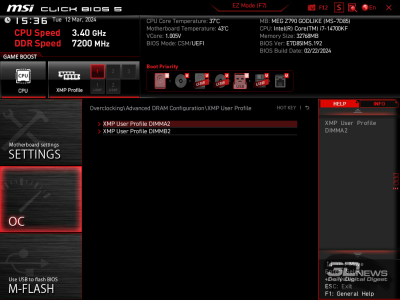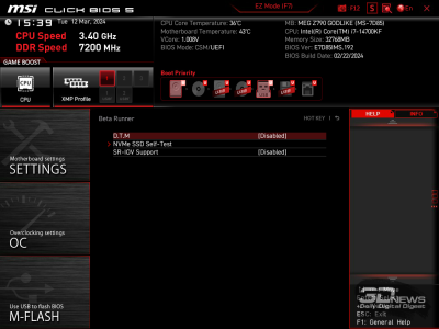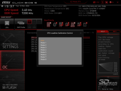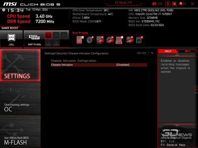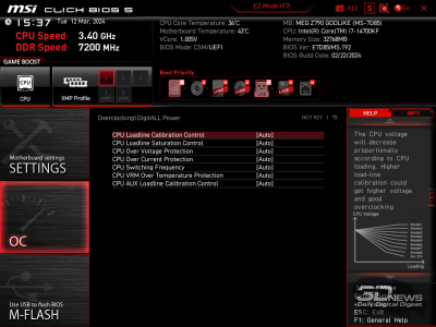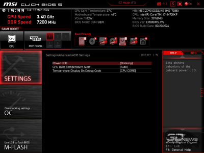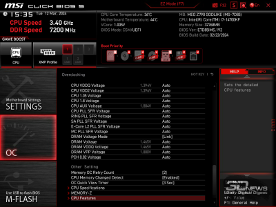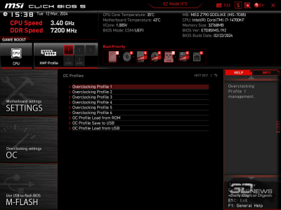 Приведу один интересный факт: прошивка MEG Z790 GODLIKE практически ничем не отличается от той, что использована в недавно протестированной MAG Z790 TOMAHAWK MAX WIFI. Это очень хорошо, что инженеры MSI не ограничивают пользователей в плане ручной настройки. Конечно, герой обзора оснащен дополнительными функциями, которых нет в платах классом ниже. Так, в BIOS устройства есть все необходимое для настройки внешнего тактового генератора, а также некоторых фирменных «фишек» — например, кнопки Smart Button. И все же основные функции прошивки были детально рассмотрены в обзоре MAG Z790 TOMAHAWK MAX WIFI, не вижу смысла повторяться.