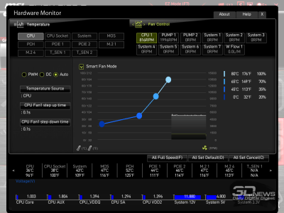 - Всего матплата оснащена восемью температурными датчиками: PCH, MOS, System, CPU Socket, PCIE_1, PCIE_2, M.2_1 и M.2_4.