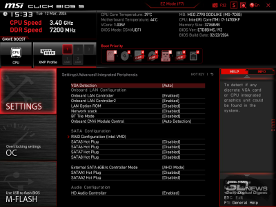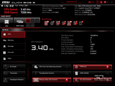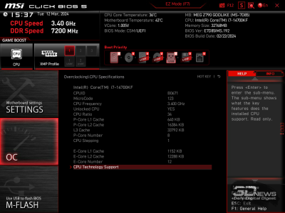 Герой обзора использует UEFI AMI BIOS с фирменной и вполне узнаваемой оболочкой Click BIOS 5. На момент написания статьи актуальной версией считалась прошивка под названием 7D85v192 — в открытом доступе она появилась в феврале. И это — уже десятая по счету версия микрокода. Естественно, плата совместима со всеми процессорами для платформы LGA1700, включая серию Core 14. Ниже в галерее приведены скриншоты всех меню и функций прошивки MEG Z790 GODLIKE.
